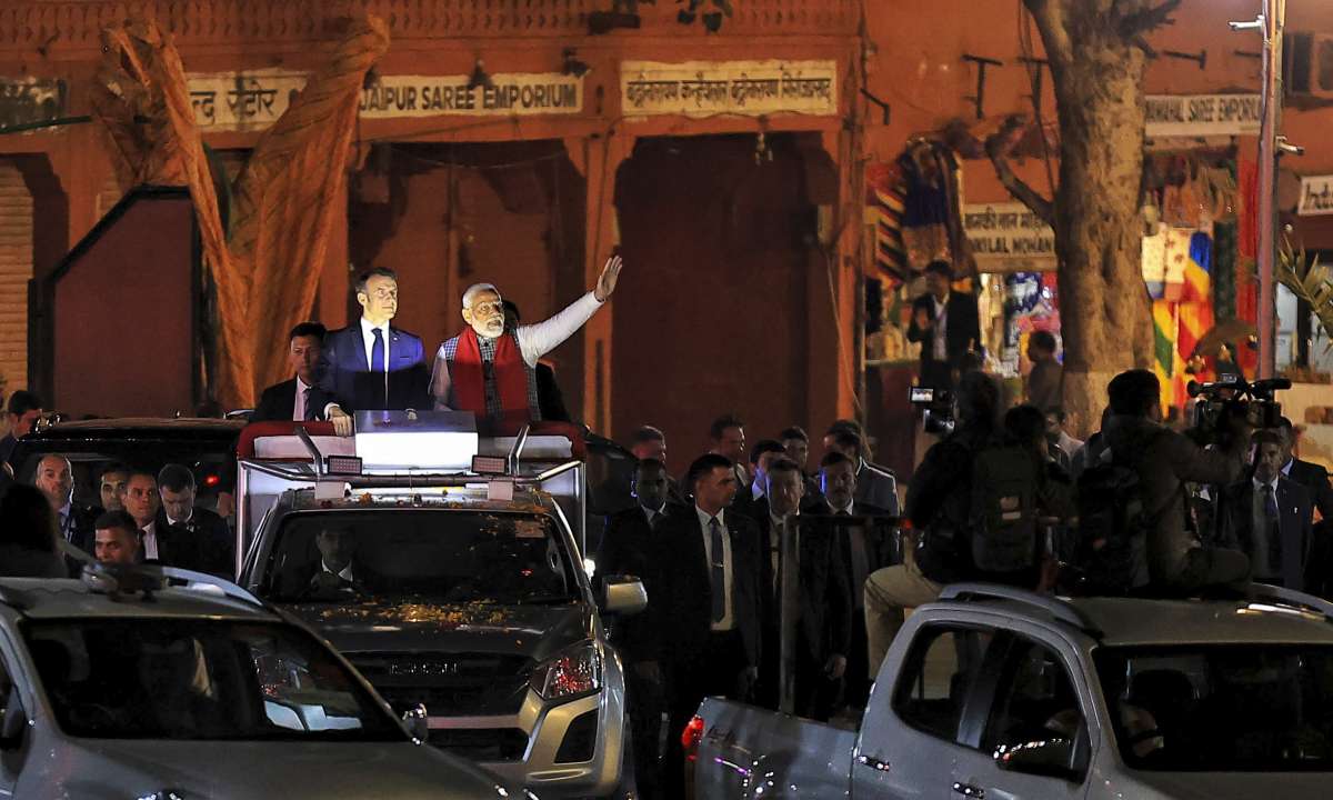फ्रांस के राष्ट्रपति इमैनुएल मैक्रॉन भारत की अपनी दो दिवसीय राजकीय यात्रा के तहत गुरुवार को जयपुर पहुंचे। फ्रांसीसी नेता गणतंत्र दिवस परेड 2024 में मुख्य अतिथि के रूप में भी शामिल होंगे। जयपुर अंतरराष्ट्रीय हवाईअड्डे पर पहुंचने पर विदेश मंत्री एस जयशंकरए राजस्थान के राज्यपाल कलराज मिश्र और मुख्यमंत्री भजन लाल शर्मा ने उनका स्वागत किया। प्रधानमंत्री नरेंद्र मोदी और फ्रांस के राष्ट्रपति इमैनुएल मैक्रॉन ने जयपुर में हवा महल का दौरा किया।